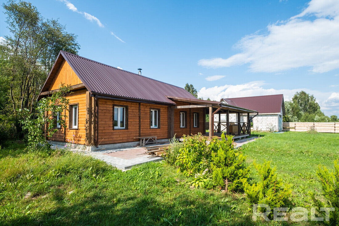В Воложинском районе продается новый дом из бруса с террасой. Внутри комнаты отделаны и обставлены мебелью и техникой. На большом участке также есть постройка под баню и беседка для отдыха. Как выглядит объект и сколько стоит?