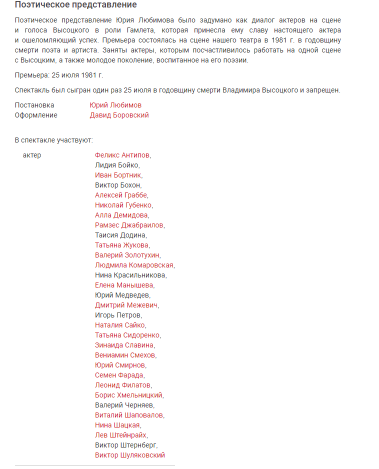 Наверное, все помнят историю мемориального спектакля "Владимир Высоцкий", который Ю. Любимову милостиво позволили показать один раз, в годовщину смерти ведущего актёра театра. И тут же запретили. Потом спектакль восстановили и даже какое-то время играли, хотя на сайте театра никаких упоминаний об этом факте нет: