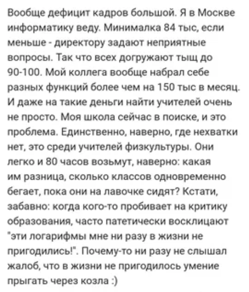 Те, кто не работал в системе, не знают нюансов, не понимают особенности работы педагогов, часто задаются "риторическими вопросами" по типу: Я в школе отработал, а потому на все вопросы знаю ответы. Да и любой это знает, кто сталкивался. А вот на одном развлекательном ресурсе была затронута тема образования и педагогов. Мне она показалась интересной, так как там давали свои комментарии как педагоги, так и те, кто считает, что учителя просто не хотят работать, так как "двоюродная сестра тёти моего мужа зарабатывает по 100 тысяч и работает до обеда". Мне бы хотелось привести комментарии от реальных людей, которые сами в теме происходящего: Я считаю, что уровень качества образования легко определяется спросом на репетиторов. Чем больше спрос, тем ярче сигнал, что делается что-то не то. Сегодня, как мне кажется, этот спрос достиг максимального уровня. Интернет вообще уже переполнен различными сервисами и сайтами, где предлагают услуги репетиторов онлайн. Закон рынка. А куда деваться ро