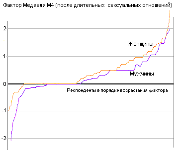 И по-моему, эти графики говорят сами за себя. И за Ангуса Джона Бейтмана тоже. Несмотря на то, что исходные данные имеют невысокую достоверность, полученное различие мужских и женских факторов Медведя настолько велико, что о распространимости ПНС на человека теперь можно говорить достаточно уверенно. На этих графиках более чем отчётливо видно, что "командуют парадом" в полоспецифических отношениях именно женщины. Кстати, рекомендую обратить внимание на экстремумы этих графиков и без комментариев напомню, что фактор Медведя является десятичным логарифмом. Не вызывает удивления то, что по мере углубления отношений (в нашем случае - по мере перехода от фактора М1 к фактору М4) экстремумы сглаживаются; другими словами - отношения становятся сравнительно более равноправными. Более удивительным может показаться то, что сопоставление распределения мужских и женских факторов по возрастанию не является зеркально-симметричным. По идее, при абсолютно честных и точных ответах площадь положительных значений мужского распределения должна иметь тот же порядок величины, что и площадь отрицательных значений женского и наоборот. Однако на приведённых графиках это далеко не так; графики, особенно мужские, сильно смещены в положительную область, что, по-моему также не может быть объяснено ничем, кроме явного или неявного лукавства.