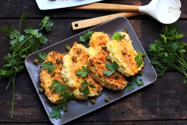 Простое блюдо, которое разнообразит ваше ежедневное меню и расширит горизонты в приготовлении цветной капусты. "Стейки" из цветной капусты — это не только вкусно и полезно, но и интересно. Сама идея овощных "стейков" для вегетарианцев и веганов появилась даже не известно где это произошло впервые, и оказалось это так вкусно, что и людям, которые любят и потребляют мясо, они понравились. Идея и рецепты быстро распространились по миру, так, как теперь напитки «кофе с тоником» или «оранж кофе». Эти стейки из цветной капусты очень нежные, вкусные, а головокружительная сырная перина, румяная и ароматная, не оставит равнодушными даже детей. А еще, готовить это блюдо просто и быстро, что и сами дети могут его готовить под присмотром взрослых. В перечне ингредиентов указана 1 средняя головка цветной капусты. Не мала и не велика. Если подойти к ней аккуратно, с такой головки можно нарезать как раз 4 «стейка». Но, может такое быть, что один распадется или получится лишь 3 «стейка». Тогда стоит и