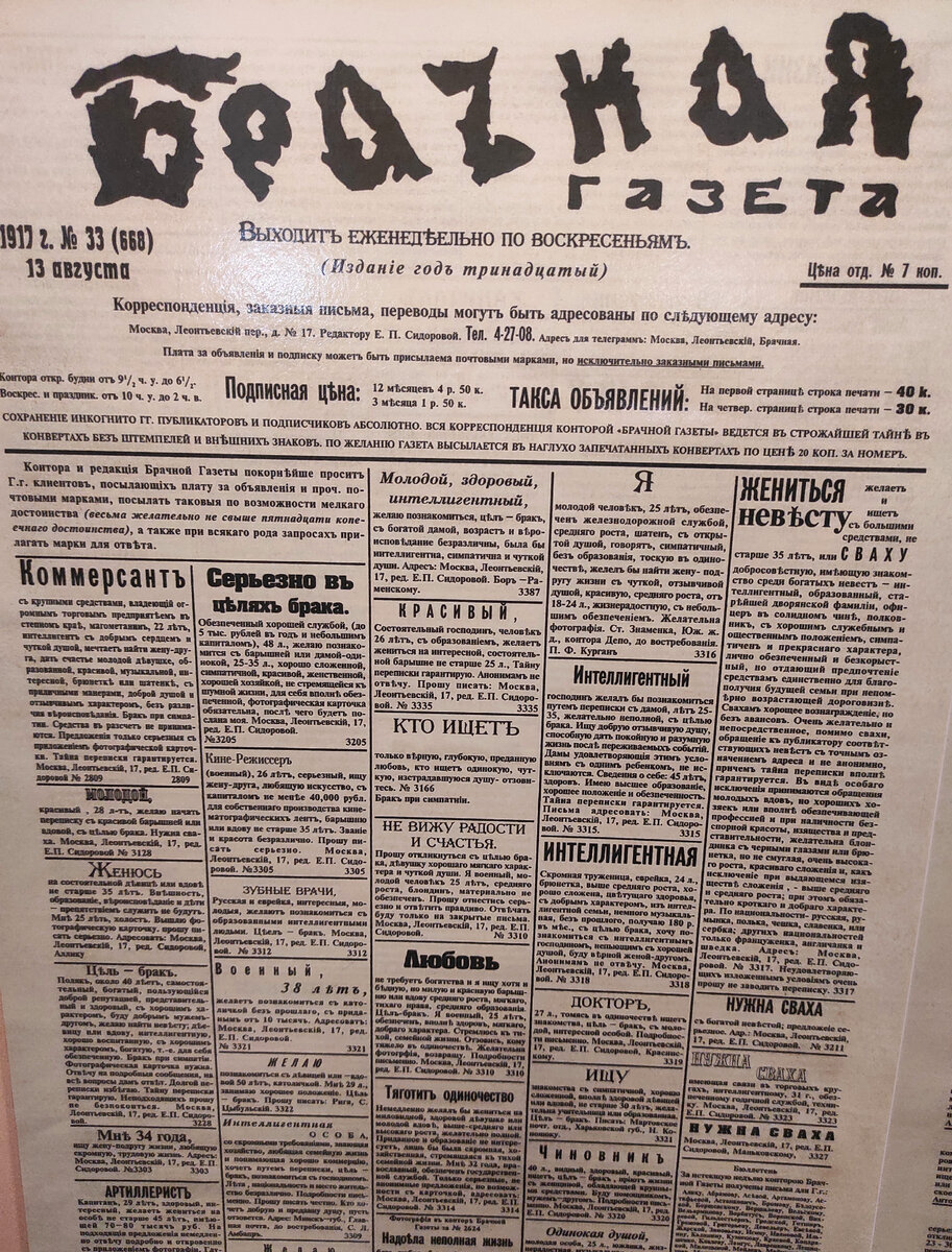 Музей городского быта 19-20 вв. "Старый Владимир", расположенный в здании бывшей водонапорной башни, порадовал не только прекрасной городской панорамой, но и своими экспонатами. Некоторые из них не оставили равнодушными ни единого посетителя. В частности, брачная газета. Времена меняются, технологии меняются, а наши людские желания обрести пару и любовь остаются. Вы только вчитайтесь.... Вашему вниманию предлагается московская Брачная газета от 13 августа 1917 года. Похоже, что вдовы, образованные и хорошо сложенные, молодые, а также девушки со средствами всегда были в цене. Аналогично и с мужчинами. Очень богатым господам везде дорога, а бедным господам разве, что почёт. Кто-то, конечно, готов был смириться и с возрастом, и даже с детьми, но только не с отсутствием денег😂 Тому кому показалось мало ниже еще объявления, но шрифтом поменьше. Вот такой старинный Tinder. Времена меняются, а требования остаются неизменными: Хорошего дня Господа хорошие!
