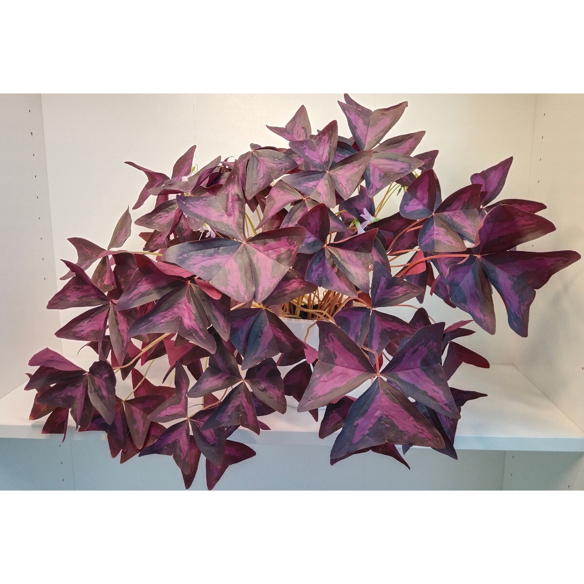 ...с верхней полки шкафа я узнала на следующий день после раздавшегося ночью на лоджии шума. На момент падения горшка куст был раза в два пышнее. Роскошная крона тянулась к свету, хоть и стояла у окошка, и листья перевесили горшок: горшок упал сначала на цветы на подоконнике, отчего пострадала только сама кислица, переломав себе веточки, а оттуда на пол, где пострадала еще больше. На полу горшок оставался несколько дней, потому что я не в силах была смотреть на то, что осталось от пышной листвы, и заставить себя взять горшок в руки. В ширину размах листьев был 70 см. На фото видно количество листьев, оставшихся после падения горшка. Несколько корешков удалось пристроить, причем некоторые из них без листьев. Много отломившихся листьев пришлось выбросить. Вот что осталось: Теперь куст кислицы, уже прижившейся в обновленной посадке, выглядит так: Потрепанный, но приободрившийся. Летом я не рассаживала этот куст, потому что не хотела его рассаживать, хоть и понимала, что вырос он массив