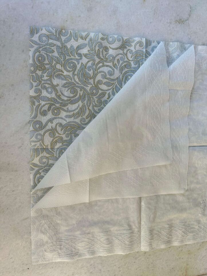 Если вы хотите сделать вазу из бумажных салфеток, первое, что нужно сделать, когда у вас есть все доступные материалы, — это удалить простые слои салфетки.