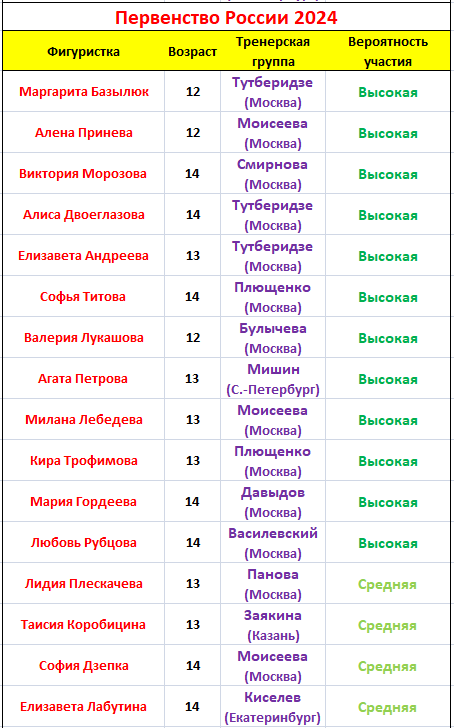 Турниры ISU нам сейчас мало интересны, а вот повышение возрастного ценза на российских стартах уже с нового сезона приведет к "юниорской толкучке", в результате которой значительная часть сильных юных фигуристок окажется без главных стартов. Напомню, что количество мест на юниорском Первенстве России ограничено числом 18. Ниже я приведу список 30 основных претенденток на эти места у девушек, с примерным указанием вероятности участия в нем каждой из фигуристок, исходя из выступлений в прошлом сезоне, а также реалий нового сезона. Заодно вы сможете посмотреть кто в какой тренерской группе сейчас тренируется. Люба Рубцова и Надя Понтелеенко сейчас травмированы и пока их перспективы несколько туманны, но я хочу их поддержать своим прогнозом.
