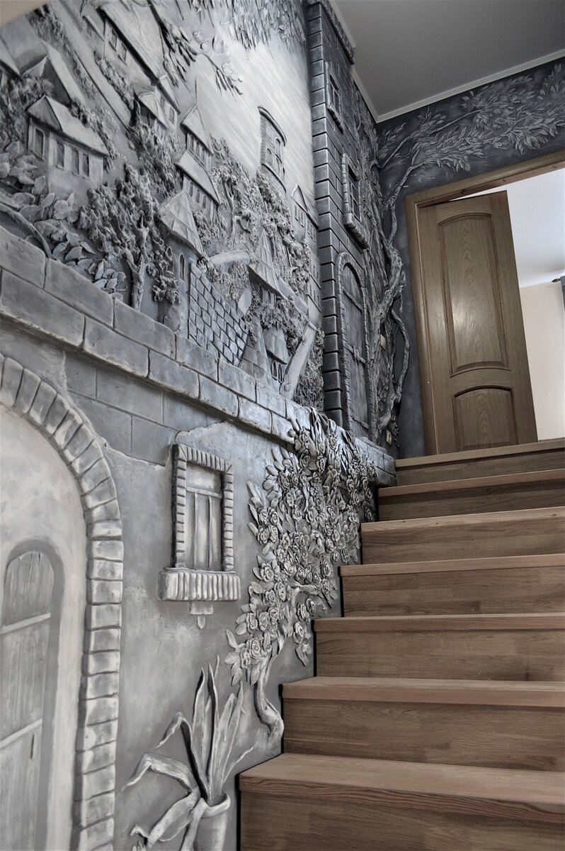 Очень сложно, если честно, передать масштаб этой работы в фотографиях. Рабочая площадь более тридцати пяти квадратов, все стены лестничного пролёта. Эта лестница ведёт из коридора на второй этаж, где гостиная, кухонная зона и санузел. И, сразу при входе в дом, открывается такой вид. Стены сейчас в персиковом цвете, что совершенно не сочетается с барельефом. Но они будут перекрашены в оттенок серого. Лестница, двери, мебель, будут белого цвета. Почему я назвала барельеф "Три перспективы"? Потому что их там три. Сразу идёт первая перспектива- ближний план. Крупные и проработанные детали. Рассмотреть их сможете, листая галерею выше. Далее, при подъёме на второй этаж, следуют ещё две перспективы: вид сверху (слева) и вид из далека. Вид сверху было прорабатывать сложнее всего, приходилось постоянно отходить, и смотреть, что я делаю. В галерее выше вы сможете увидеть результат. В целом вышло очень атмосферно. Заказчики довольны, я тоже, в общем то. Жду, когда приведут всё остальное в надлежа