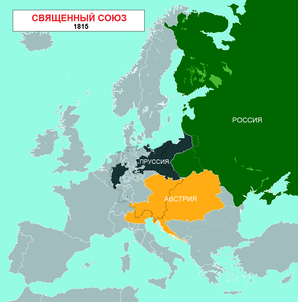 — Да. Германии же еще как таковой не было. Были Пруссия, Австрия и несколько мелких княжеств. Но именно Пруссия, Австрия и Россия объединились в «Священный союз» для гарантии установленного международного порядка и для подавления любых революций. Это союз призвал всех христианских государей к взаимопомощи. И правители континентальной Европы один за другим все постепенно присоединились. Кроме Папы Римского и Турецкого султана.