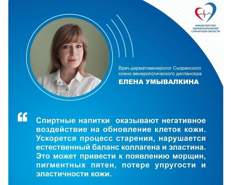 Врач-дерматовенеролог Сызранского кожно-венерологического диспансера Елена Умывалкина рекомендует отказаться от алкоголя. И дело не в печени, которая, как сразу приходит на ум - страдает первой. Дело, по мнению врача, в молодости и красоте, так как алкоголь негативно воздействует на кожу. «Кожа является нашей первой защитной барьерной линией и отражает все изменения, происходящие внутри организма. Алкоголь обладает выраженными дегидратирующими свойствами - способностью выводить воду из организма. Этот фактор является основной причиной появления сухости и шелушения кожи», - читает Елена Умывалкина.
