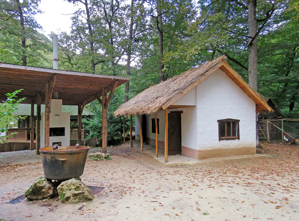 Здесь на фоне такой висят щичепшин (смычковый инструмент) и пхачич (трещётки), равно как и у другой стены - пастуший рог на фоне бурки. В углу же, почти на уровне пола, располагался очаг под куполообразным дымарём, и настоящей святыней дома, его константой, считалась зи - висящая в нём цепь.