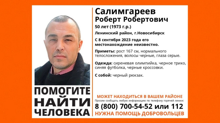 В Ленинском районе Новосибирска без вести пропал 50-летний Роберт Салимгареев. 8 сентября 2023 года сибиряк ушел в неизвестном направлении. Теперь его ищут волонтеры поисково-спасательного отряда (ПСО) «ЛизаАлерт». Приметы пропавшего: рост 167 сантиметров, нормальное телосложение, волосы черные, глаза серые. В день исчезновения был одет в сиреневую олимпийку, черное трико, синюю футболку и черные кроссовки. С собой у мужчины был черный рюкзак. Если у вас есть информация о местонахождении Роберта Салимгареева, сообщите об этом по телефону ПСО 8-800-700-54-52 или наберите 112. Ранее «Вести Новосибирск» рассказывали, что без вести пропал 45-летний кареглазый мужчина.