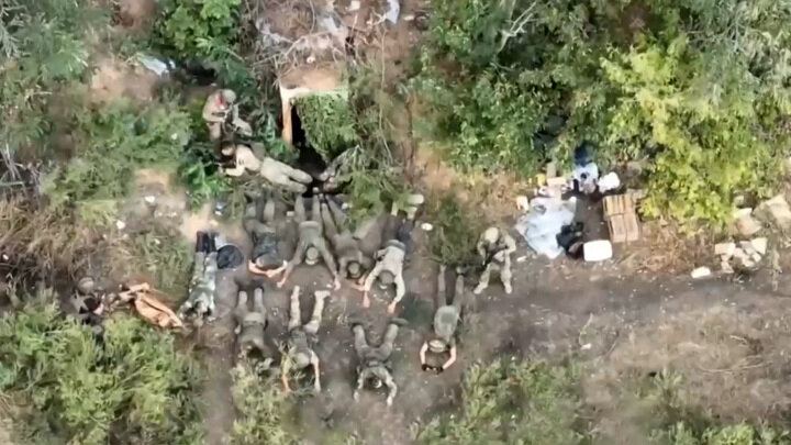 Четверо российских бойцов, заметив движение в укреплении противника, осторожно пробираются к нему – видимо, предлагая противнику сдаться.Поначалу из укрытия выходят двое, потом четверо украинских военных, которые безропотно ложатся на землю. Через несколько минут оказывается, что в укрытии их было 11.
