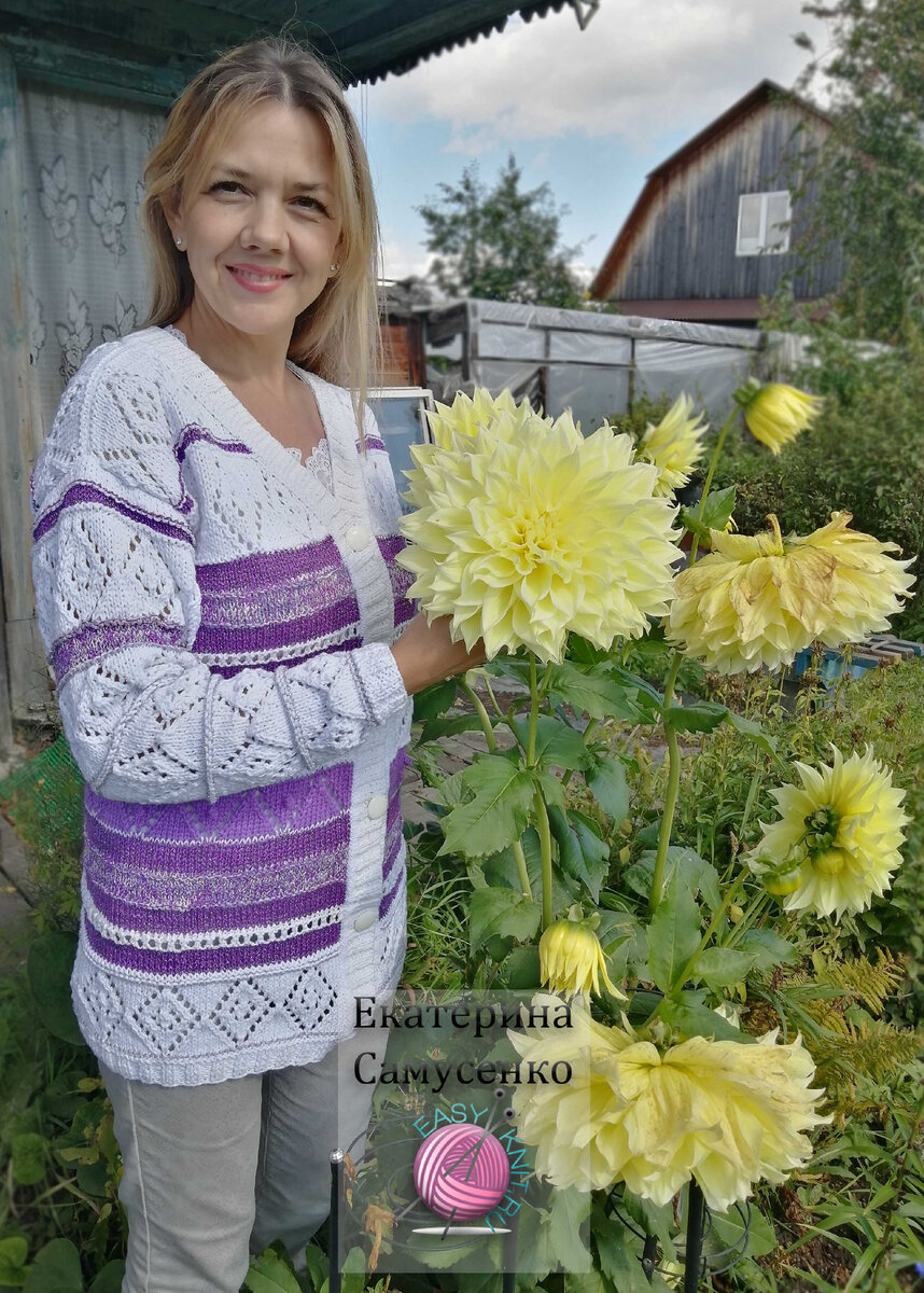 Кардиган спицами начинала вязать в начале июня, вязала его в совместном проекте "цветовые сочетания", решила скомбинировать несколько видов пряжи, но придерживаясь одной гаммы оттенков: белого, светло и темно сиреневого. В полосках миксовала пряжу с радужными пайетками, с серебристым люрексом , а также однотонную. Конечно преобладал в кардигане белый цвет с ажурными ромбами.
