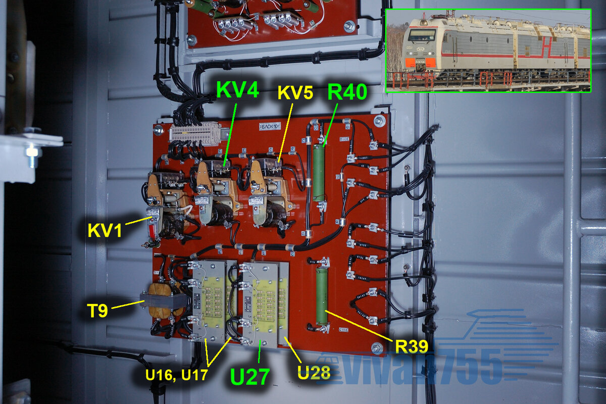 Машины здесь постоянного тока, справа красным залиты якоря тяговых двигателей, а слева зелёным залиты якоря двух двигателей вентиляторов и двух двигателей компрессоров. Ниже залиты «кубики» реле 230 ... 233, но это не катушки, как можно было бы подумать, а чувствительные элементы тепловых реле.