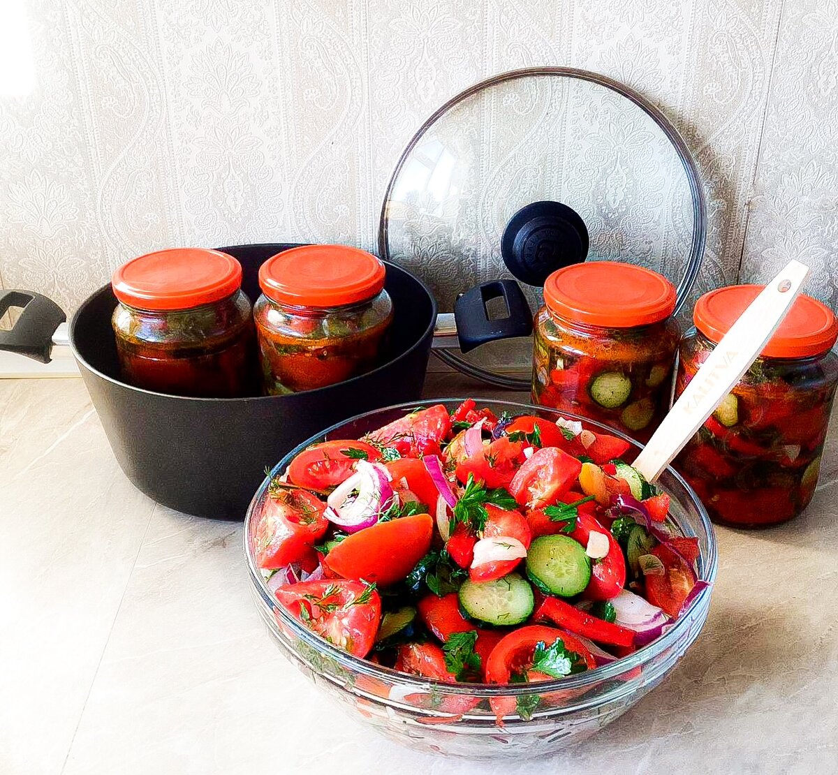 Салат шакароб – национальное блюдо таджикской кухни, который подается к плову. А плов, как известно, готовят не только в Таджикистане, но и в других азиатских странах. В Узбекистане его называют ачик-чучук. Несмотря на простоту приготовления и ограниченное количество ингредиентов, салат получается очень вкусный. Нам понадобится: ✅ 2,5 кг помидор ✅ 1 кг огурцов ✅ 700 грамм болгарского перца ✅ 400 грамм красного лука ✅ 400 грамм репчатого лука ✅ 150 мл растительного масла ✅ 1 головка чеснока ✅ 1 пучок укропа ✅ 1 пучок петрушки ✅ 1 пучок базилика ✅ 2 столовые ложки соли ✅ 0,5 чайной ложки сахара в каждую 0,5 литра банку ✅ 0,5 чайной ложки уксуса 9% в каждую 0,5 литра банку ⠀ ⠀Способ приготовления: Огурцы замочить на 3 часа в холодной воде. Подготовить овощи: вымыть и нарезать: помидоры - дольками; огурцы - кружками; лук – полукольцами; сладкий перец - соломкой или кусочками. Переложить овощи в миску. Добавить нарезанный чеснок и зелень. Посолить. Полить растительным маслом и перемешать. О