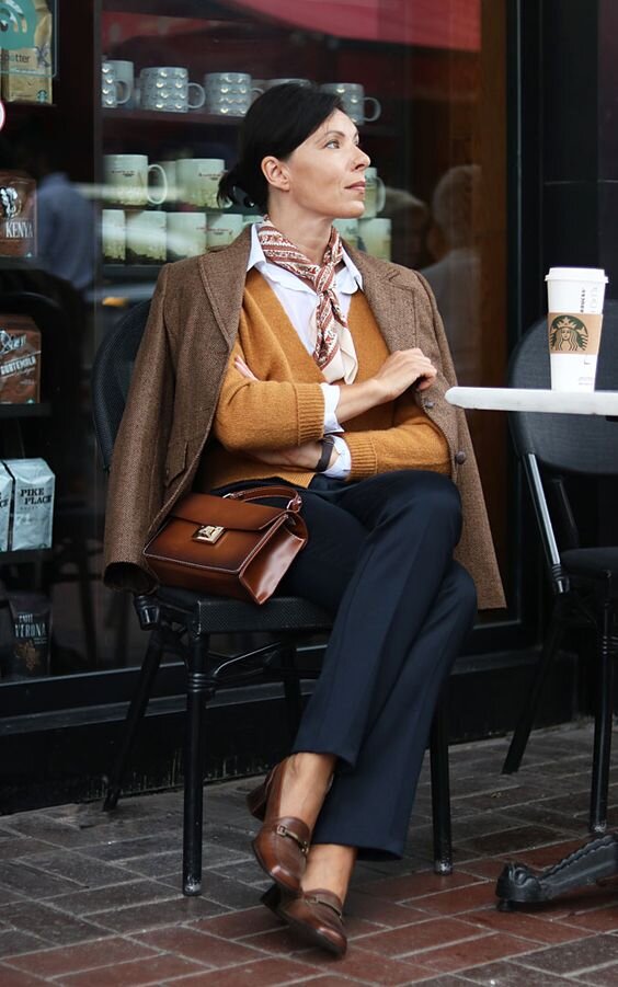 Монохромные образы, это тренд 2023 года, темно-синие брюки и джемпер отлично подойдут для офиса. Дополните наряд лодочками и сумкой карамельного оттенка, а также минималистичными аксессуарами: атласным платком и золотыми украшениями.