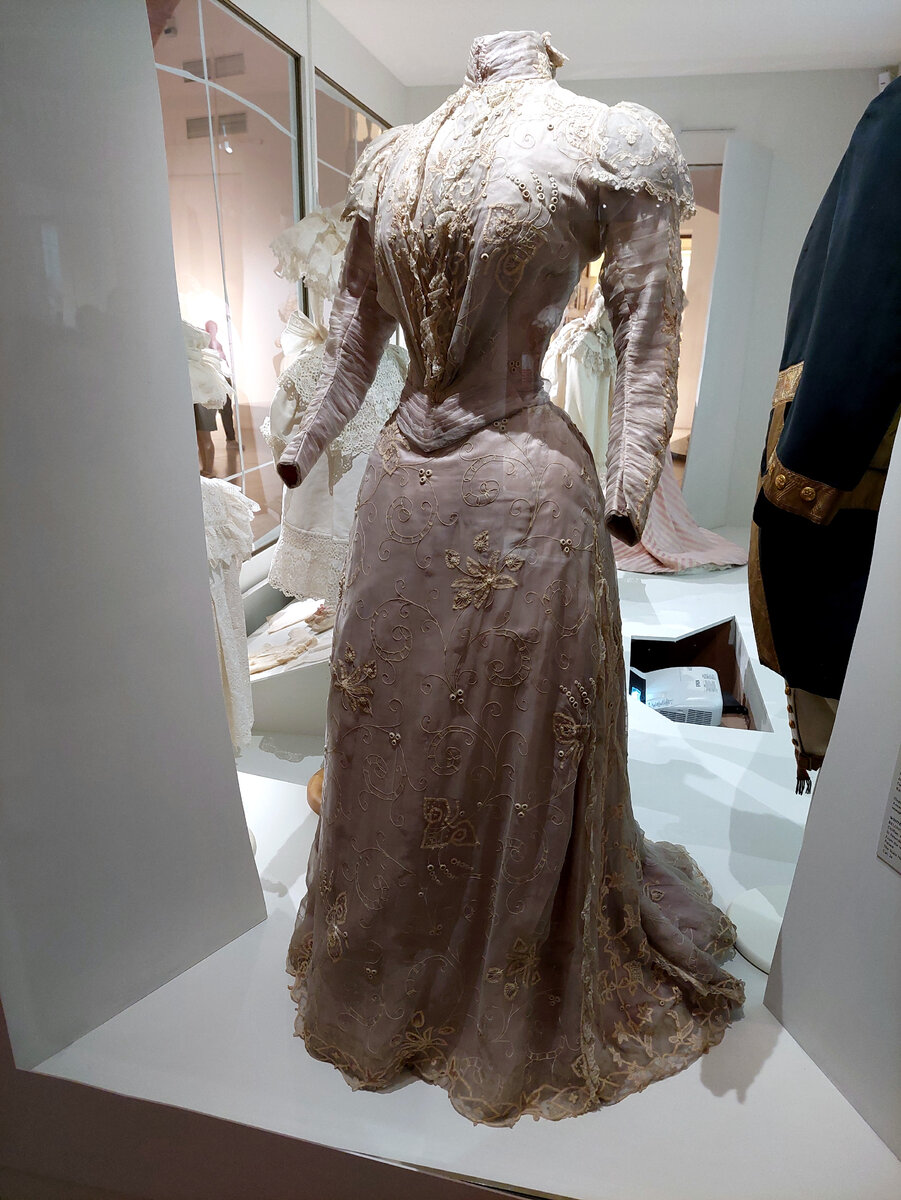 Это летнее платье из белого шифона на сиреневом чехле (сиреневый – любимый цвет императрицы). Платье из гардеробной императрицы в Зимнем дворце, изготовлено было в мастерской А.Бризак в 1897 году.