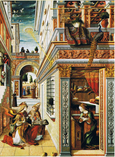 Рассмотрим картину «Благовещение со святым Эмидием», 1486 г. Автор этой картины Карло Кривелли изобразил момент осознания Девой Марией своей великой миссии о рождении Иисуса Христа.