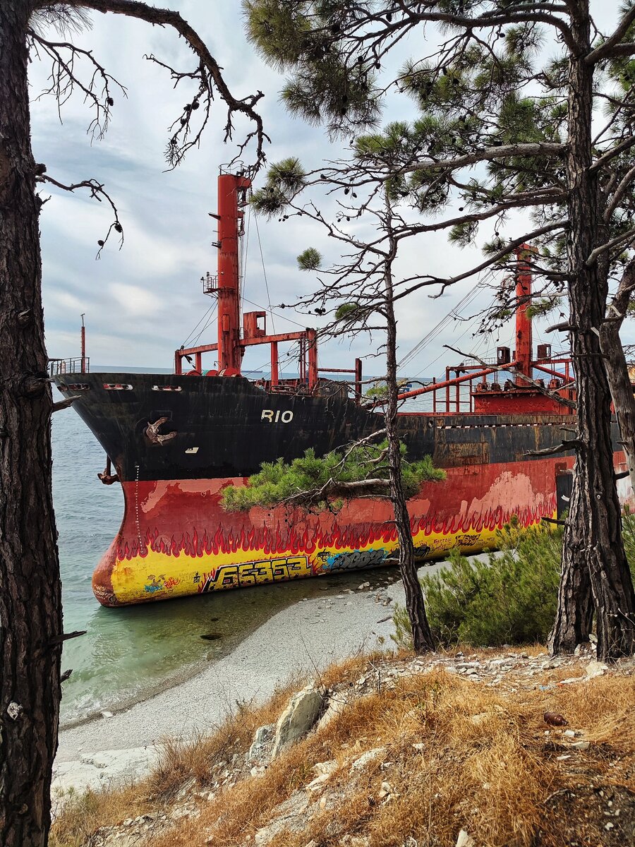 Правда состоит в том, что «Рио» действительно осталось недолго. В прошлом году Министерство транспорта РФ включило балкер в список объектов, которые надо демонтировать. Сухогруз должны разобрать до 2025 года, чем уже мало-помалу занимаются. В борту вырезали большое прямоугольное отверстие, через которое вывозят мелкие детали, а внутри я увидел подъёмный кран. Но, судя по всему, в курортный сезон все работы свернули, чтобы дополнительно заработать на большом потоке любопытствующих.