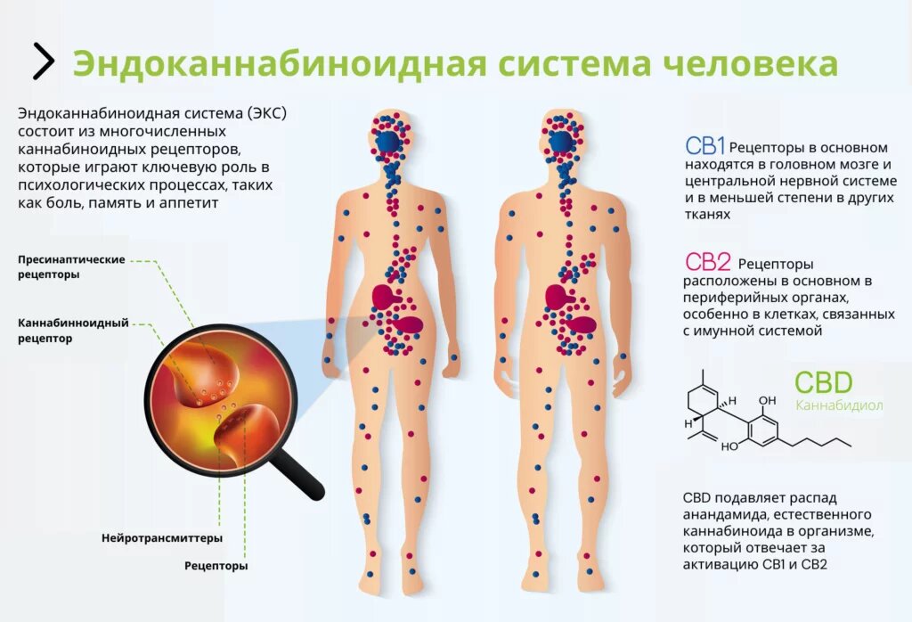 Эндоканнабиноидная система охватывает весь организм и является частью его естественной функции. Эндоканнабиноиды (и их рецепторы) расположены в головном мозге, органах, соединительных тканях, железах и клетках по всем телу.