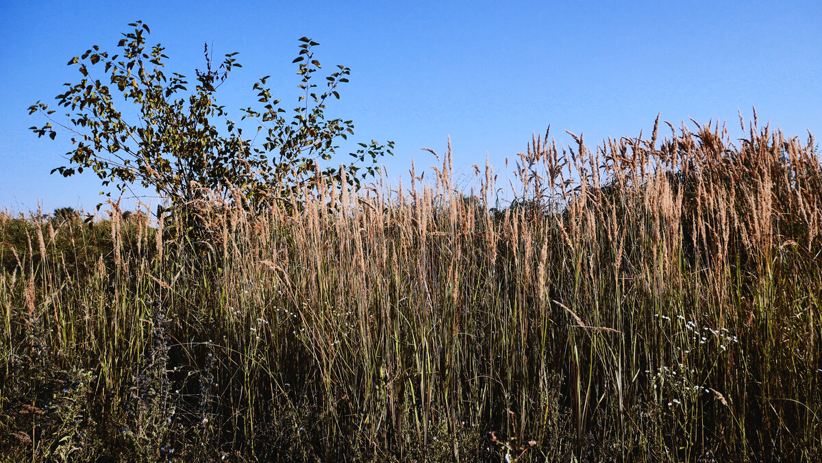 Степная трава своей густотой заполняет всё вокруг. Даже молодые деревца выглядят на её фоне совсем слабыми.