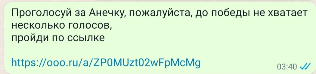 Мошенники в Вацаппе и Телеграм рассылают ссылки со спамом, заходить на которые опасно. История из жизни. Неделю назад от моей близкой родственницы в Вацапп пришло сообщение: "Привет, проголосуй, пожалуйста, за Анечку, до победы не хватает несколько голосов", перейди по ссылке ******************** *** Воспроизвожу удаленное сообщение, которое примерно выглядело так: Удивилась, что за Анечка, у нас нет такой родственницы. В ответном сообщении спросила: "Скажи, что за Анечка?" Родственница написала, чтобы я ни в коем случае не открывала ссылку, это спам. Почему-то сразу так и поняла, что это таит угрозу, удалила сообщение со ссылкой и забыла о данном случае. Через пару дней позвонила по Вацаппу родственнице, и она рассказала, что кто-то взломал её сеть Вацапп, и от её имени разослал всем её контактам подобную рассылку. Некоторые ничего не подозревавшие, открывали ссылку и ничего не поняв, перезванивали, спрашивая: "В чем дело? Родственница ринулась спешно удалять отправленную