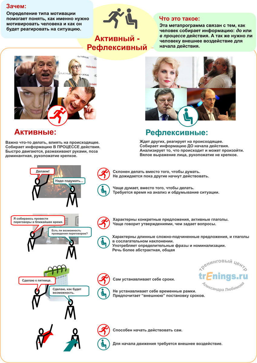 Есть люди, которые если собираются что-то купить, предварительно тщательно собирают информацию – читают рекомендации и отзывы, опрашивают друзей, несколько раз осмотрят предполагаемую покупку, поговорят с продавцами… Другие прибегают в магазин, попросят показать «получше», выбирают и покупают. Эти различия в поведении проявление метапрограммы «мотивация активный – рефлексивный». И она касается в первую очередь того, как люди собирают информацию – до действия или во время действия.