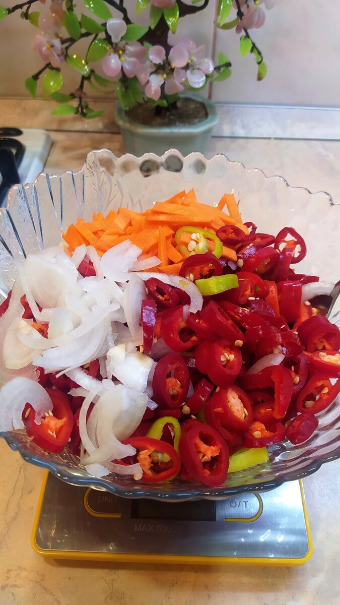 В прошлом году впервые попробовала приготовить этот перец к мясу. Через месяц уже жалела, что мало сделала - вкусный не то слово! Никакой соус, кетчуп, горчица не сравнится с этим перцем к мясу! У нас по острым блюдам - соусам, аджикам и т.п. проходится мужская часть семьи. Но этот перец даже я с большим удовольствием пробую. В данном рецепте всё гармонично, перчик получается кисло-сладенький, аппетитный, пикантный и очень-очень вкусный. И готовить его проще некуда! Точные пропорции пропишу в первом комментарии под этой публикацией. Как делать: Острый перец нарезать тонкими колечками. Чтобы перец красиво смотрелся, я выбираю его разных цветов (зелёный, красный) Репчатый лук - полукольцами. Соломкой нарезать сладкий перец и морковь. Маринад: В кастрюле соединить: яблочный уксус, воду, сахар, соль, горчицу в зёрнах. Маринад довести до кипения. В маринад забросить подготовленные овощи. Закипятить и варить 5 минут. Разложить по стерилизованным баночкам, плотно закрыть крышками (если вин