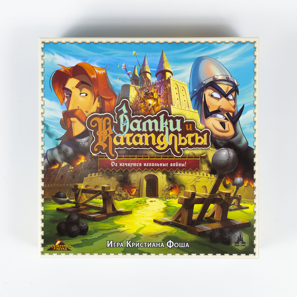 Оригинальное название: Catapult Feud, Catapult Kingdoms Жанр игры: координация, ловкость Издатель в России: Низа Гамс Количество игроков: 2-4 Сложность правил (по данным сайта BGG): 1,11 Возраст: от 14 Время партии: 20-30 минут Замки и катапульты это настольная (а иногда и напольная) игра на ловкость и координацию). Вчера неожиданно ее достали, поэтому решил написать статью Цель игры Построить замок так, чтобы защитить расположенных на нем солдат. Игрок, который первым сбил всех солдат соперника побеждает. Что в коробке? Мы покупали игру сразу с допами (про них в итогах), поэтому опишу сразу что в базовой коробке и в коробках с допами. В базовой игре для каждого игрока в игре есть: планшет, 5 солдат, катапульта, 4 снаряда, 17 блоков (из них 1 ворота), маркер дистанции и 6 карт действий В дополнении "Две башни" для каждого игрока добавляются: 1 таран (у этого орудия особое правило для перемещения и стрельбы, 6 карт действий, 2 улья, 12 элементов башни (большие и малые блоки и парапет