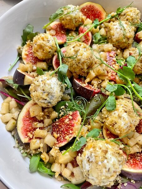 🥗 Сверху салатных листьев выложить нарезанный инжир, полить заправкой, добавить сырные шарики, посыпать остатками орехов и добавить ростки гороха ✅