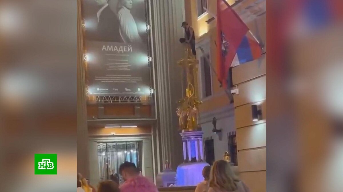 [ Смотреть видео на сайте НТВ ] В Москве у Театра Вахтангова мужчина залез на скульптуру «Принцесса Турандот». Он позировал десяткам прохожих, снимавших его на телефон, но упал в фонтан и получил серьезные травмы. Сейчас вандал в больнице. На Старом Арбате в Москве мужчина ночью забрался на скульптуру «Принцесса Турандот», позировал прохожим, после чего сорвался и упал в фонтан. Как позже удалось установить, нарушителем спокойствия оказался 23-летний москвич Виктор Руссо. Во время инцидента он был сильно пьян, в результате падения получил серьезные травмы. Кристина, очевидица: «Не знаю, живой он был или нет, но с таким грохотом [упал. — прим. НТВ]. Охранники вызвали скорую, потом приехала полиция. Я видела, как его [в машину скорой помощи. — прим. НТВ] заносили». Фонтан-памятник «Принцесса Турандот» находится прямо посередине Старого Арбата, исторического места. Сюда приезжают сотни москвичей полюбоваться статуей и просто провести время в романтической обстановке. Здесь всегда много ту