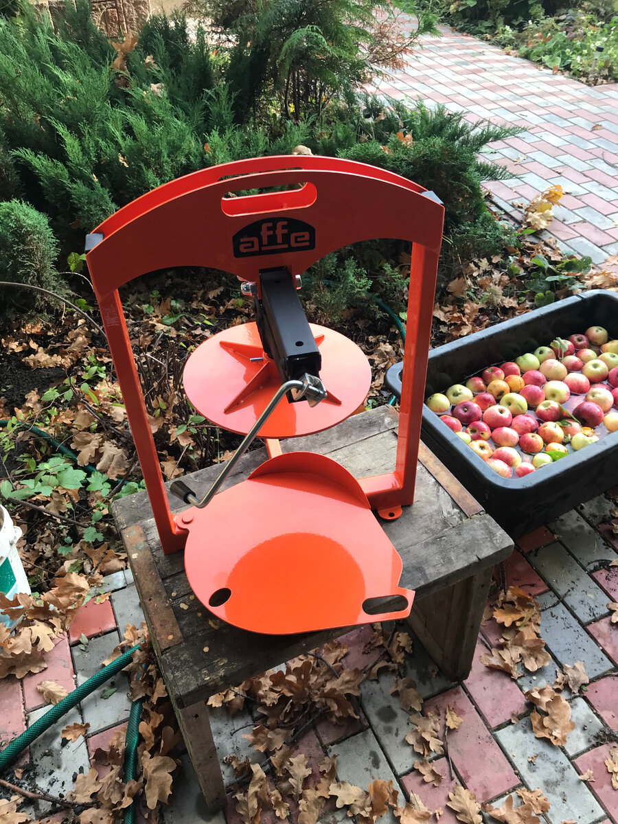 Обзор соковыжималки AFFE Добрый день! Была приобретена соковыжималка. Выглядит "уверенно". Домкрат 2 тонны. К соковыжималке приобретён измельчитель, так же дополнительно приобретены мешки для мезги (запасные). В комплекте идёт с одним мешком. Перекладываем мезгу в мешок и начинаем давить. Итак: из 2,5 ведер яблок вышло примерно 7 литров сока. Результат устраивает. В целом всё устроило. Выполнено качественно. Для небольшого кол-ва яблок (да и виноград с помидорами думаю пойдёт на ура) объёма хватает (10 литров). Ссылка на видео