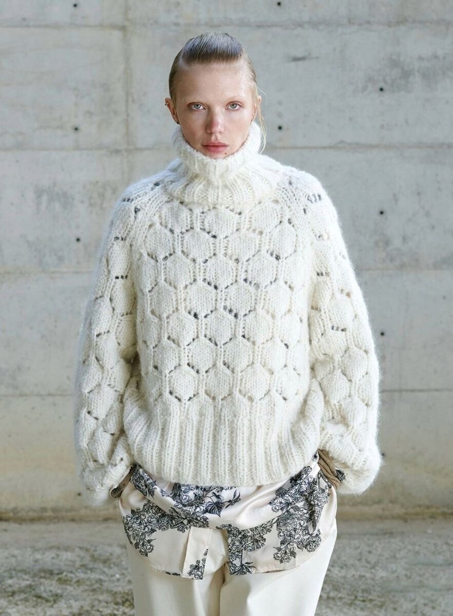 Горловина такая мне совсем не к чему, да и свитер не хочу, хочу кофту, а вот узор и пышные рукава это то что надо.