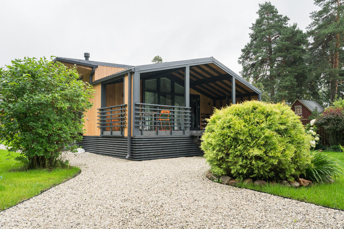 В РАСПОРЯЖЕНИИ БОЛЬШОЙ УЧАСТОК И СОВРЕМЕННЫЙ ДОМ-КВАРТИРА, В КОТОРОМ ДАЖЕ ДЫШИТСЯ ЛЕГЧЕ "Раньше мы жили в квартире в Москве. Джесси, моя любимая собака, совсем не выносила летнюю жару и место у нее было в углу комнаты. Ни побегать, ни подышать свежим воздухом. А сейчас в распоряжении большой участок на 10 соток, лежанка у большого окна и современный дом-квартира, в котором даже дышится легче. Она очень любит смотреть за своими владениями" Юлия Красивому дому - красивый участок! Первое и второе дополняет друг друга. И каждый, кто задумывается о загородной жизни, уже заранее представляет свой будущий дом. Этот изящный барнхаус 66м2 расположился на Юге Московской области. Владелец дома Юлия - человек с аналитическим складом ума, постоянно в работе с финансами. Взвесив все за и против, выбрала именно жизнь за городом, поменяв быстрый городской ритм на тишину в окружении лесного массива. Юлия описывает свой новый модульный дом 66м2, как шикарное пристанище для жизни, удаленной работы, вече