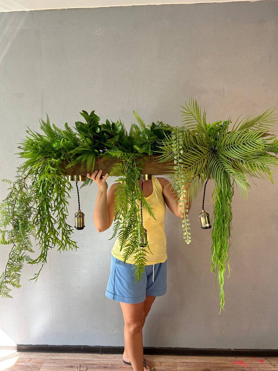Уникальные предметы декора сами находят своих владельцев. Так произошло с нашей авторской работой «Лофт светильник с озеленением». Она улетела дарить магию природной красоты и света на Камчатку. Это очень далекое путешествие, потому что наша компания Праздник Сити находится в Краснодаре. Клиенты три месяца искали специалиста, который предложит им интересные подвесные композиции на окна. Они перебрали много вариантов и, однажды, просматривая сторис наших работ в интернете, влюбились в эту модель. Она была сделана в размере 150 см на 5 ламп для санатория в центр развлечения гостей и придавала особенный стиль интерьеру. Для того чтобы светильник пропорционально выглядел в интерьере новых владельцев мы внесли небольшие изменения с учетом помещения. За основу был взят природный материал — натуральное дерево с красивой фактурой. Его размер 100 см. Установлены премиум патроны бронзового цвета с витым проводом под лампы Эдисона (ретро лампы), которые сейчас на пике популярности. Для наполнени