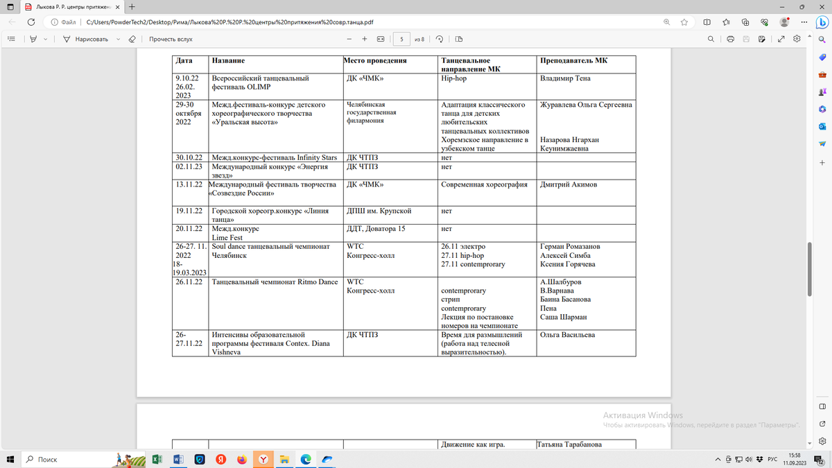 За последние 5 лет в нашем городе больше чем вдвое увеличилось количество различных хореографических фестивалей и конкурсов. Я попыталась собрать их и систематизировать в одной таблице. В ней представлены данные за 2022-2023 учебный год, однако почти все из представленных конкурсов повторяются с периодичностью 1-2 года. Так же в данной таблице обозначены мастер классы по танцевальным дисциплинам и педагоги-преподаватели. Это не все мастер-классы, которые проходили в Челябинске за прошлый учебный год, а лишь те, которые проводились в рамках хореографических конкурсов.
