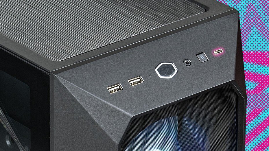 Причем отдельных необычных элементов тут и не выделить. Весь корпус выглядит так, будто пришел к нам из какого-то мира далекого будущего. Металлическая сетка с полигональным дизайном на лицевой панели корпуса отлично сочетается с обрамляющими ее изломанными под совершенно непредсказуемыми углами пластиковыми гранями, а на скошенной верхней части панели размещаются пара портов USB 3.2 Gen 1, один USB 3.2 Gen 2 Type-C, 3,5-мм комбинированный аудиоразъем, кнопка подсветки и клавиша включения с контуром в виде логотипа Cooler Master.