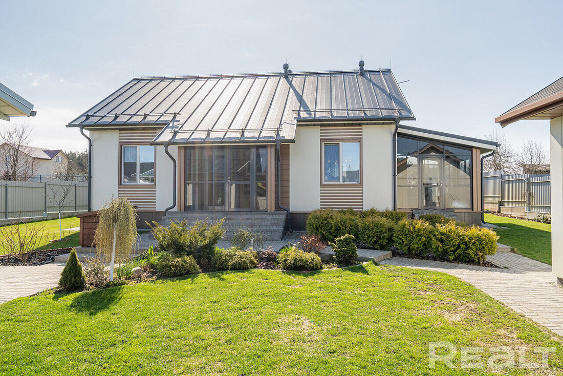 Дом с застекленной террасой продается недалеко от Минска - в СТ на стыке с деревней Закаблуки. Его построили из металлоконструкций, внутри сделали ремонт и провели все необходимые коммуникации. На участке возведена и баня со спальным местом на втором этаже. Посмотрите, как выглядит дом и участок. Дом построили в СТ "Деметра-2001" в 2018 году из металлических конструкций. Фундамент - ленточный. Металлокаркас заполнен минеральной ватой. Во внешней отделке сделана система вентилируемого фасада с комбинацией различных отделочных материалов (металлические панели, керамогранит, цоколь). На крыше лежит фальцевая кровля. Общая площадь двухэтажного дома - 94,4 м². Внутри есть совмещенная кухня-гостиная-столовая и две спальни - хозяйская и детская. Стены отделаны двумя слоями гипсокартона, поклеены обои, в кухне и санузле - плитка. На полу лежит керамогранит, установлена система "теплый пол". В прихожей полы бетонные, в спальнях лежит ламинат. Потолки в доме окрашены. Санузел - совмещенный. Тут