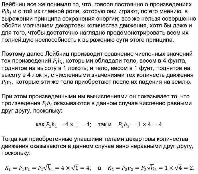 После чего, Лейбниц специально обращает наше внимание на этот, явно бесспорный факт, заявляя при этом, что, после падения, количество движения тела, весом в 1 фунт, поднятого на высоту в 4 локтя, составляет лишь половину от количества движения тела, весом в 4 фунта, поднятого на высоту в 1 локоть; а между тем их силы, найденные им несколько выше, оказались в обоих случаях равны.