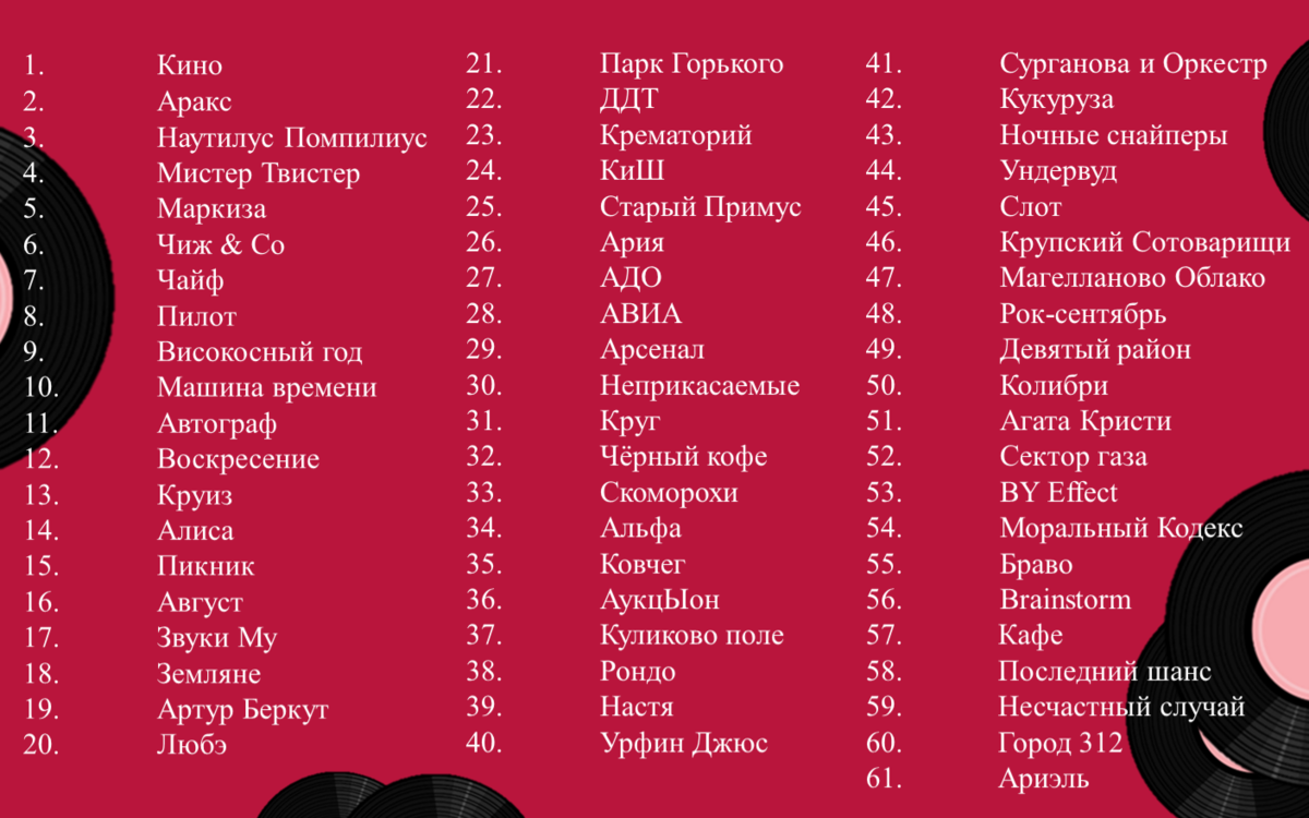 Все дизы (два человека побаловались в этот раз) посмотрела, прибавила обратно группам. Соответствие не изменилось. По-прежнему на первом месте остаётся "Воскресение", второе разделяют "Кино" и "Наутилус Помпилиус".
