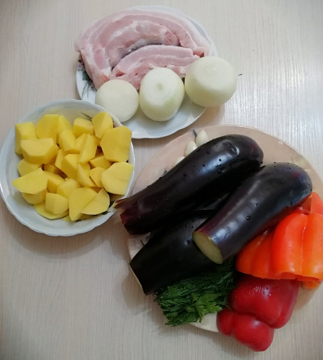 Всем привет! Сегодня готовлю свои любимые баклажаны с мясом и овощами в духовке. Нам понадобится 3 средних баклажана, 400 гр. свиной грудинки, 3 болгарских перца, 3 луковицы, несколько зубчиков чеснока, зелень, соль, специи. Я взяла ещё 500 гр. картофеля, а вы можете добавить другие ваши любимые овощи. Сначала маринуем мясо. Грудинку нарезаем пластинами, лук режем полукольцами. Тщательно обминаем его руками, чтобы дал сок, добавляем мясо, соль, перец, пряные травы, перемешиваем и оставляем на час. Тем временем готовим овощи. Перец режем крупными квадратами, баклажаны в произвольной форме, но не мелко. Картофель, если мелкий на 4 части. Измельчаем чеснок и зелень. Когда мясо промаринуется, выкладываем его в форму для запекания. Всё овощи перемешиваем и добавляем к мясу. Ставим в духовку при 200 градусах минут на 50. Готовое блюдо посыпаем нарезанной зеленью. Приятного аппетита!