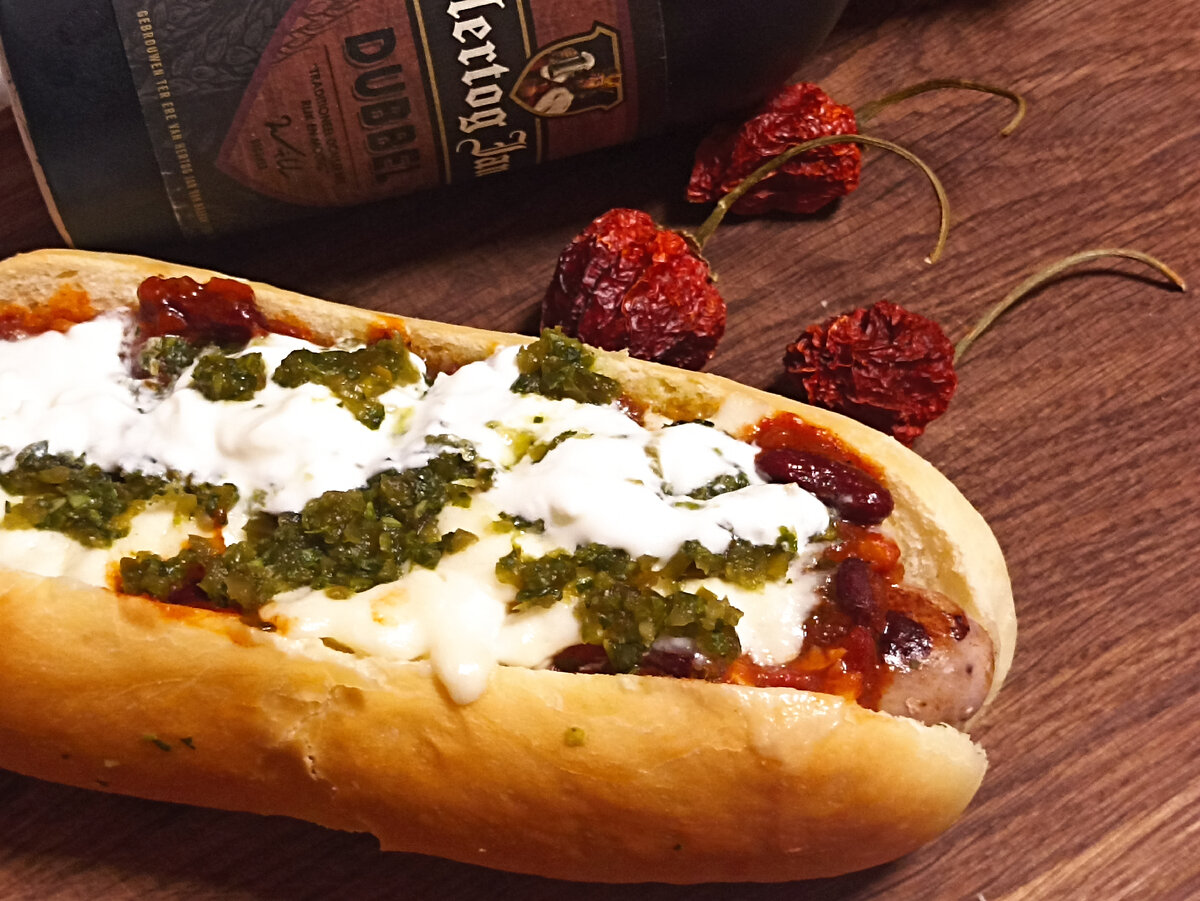 В булочку выложите жареную колбаску, сверху чили из фасоли, затем моцареллу. Выложите на противень, поставьте в духовку, чтобы сыр расплавился и немного подрумянился. Выньте из духовку, выложите сальсу из халапеньо и полейте йогуртом.