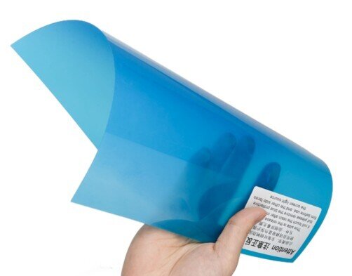 - глянцевый слой (который соприкасается с полимером) покрыт защитным слоем (голубой), который необходимо удалить перед установкой. Удалять нужно аккуратно, не за один уголок, чтобы не деформировать до установки.