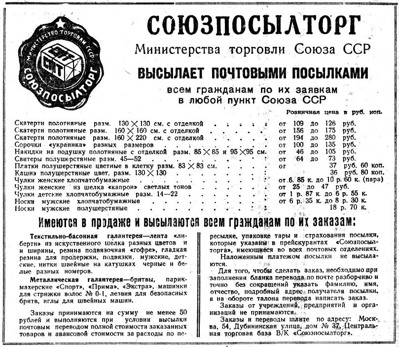 С 1949 по 1955 год включительно ассортимент высылаемых товаров "Союзпосылторга" достиг 3500 наименований. Всего населению было отправлено товаров на полтора миллиарда рублей. Но не все товары дошли...