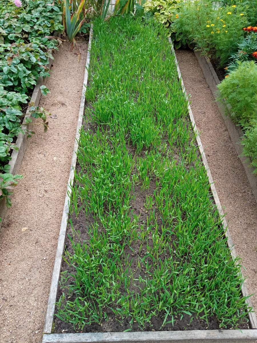 По саду прогулялись, заглянем в огород. Две грядки, засеянные сидератами, не узнать. Про то, как я их сеяла, и почему выбрала именно овёс с викой, можно посмотреть тут: Посевы поднялись примерно сантиметров на десять. Овса явно больше, чем вики. Наверное, он дешевле. 🙂 Как всегда, если берете смесь чего-либо, больше всего в ней будет самого дешёвого компонента. Я так давным-давно крокусы покупала: в смеси из 25 штук был один крупный белый, один крупный фиолетовый, а остальные жёлтые мелкоцветковые. Плавали, знаем. Еще на одной грядке был парничок с перцами и баклажанами. Надеяться на то, что ещё что-то вызреет, уже нет смысла. Поэтому парничок разбираем, растения убираем. Базилик, почувствовав, что его никто не щиплет (хозяева в отпуске), воспрял духом и рванул. Такого "ковра" не было всё лето. В тепличке нас встречают огурцы-переростки. Это они за неделю так вымахали. Неделю назад сын, оставленный на хозяйстве, всё собрал. Представляю, до какого размерчика они выросли бы за две