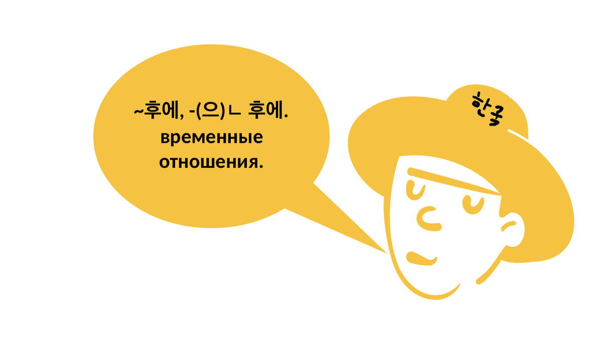 На этом уроке мы научимся составлять предложения с грамматической конструкцией ~후에, -(으)ㄴ 후에 Эта конструкция используется для выражения временных отношений и переводиться «после чего-либо» Более подробное описание грамматической формы по этой ссылке. Возьмём предложение: Я поеду в Корею через 2 месяца. Вспоминаем необходимые слова: 한국 (Корея); 나 (я); 달 (месяц); 가다 (идти/ехать). Начнем делать перевод предложения. Разложим и сопоставим слова согласно шаблону и будем соблюдать такую же очередность. При подборе окончаний и грамматики нужно соблюдать правила их использования. Их можно будет найти в конце статьи. Выбираем спряжения глагола к данному предложению с помощью карты спряжения глагола (выбираем будущее время и неформальный вежливый стиль речи). Карту спряжения можно найти по ссылке в конце статьи. Вот такое предложение должно у нас получится: Попробуем составить предложение с глаголом: Я ел в ресторане после того, как сходил в университет. 나 (я); 대학교 (университет); 식당 (ресторан); 먹