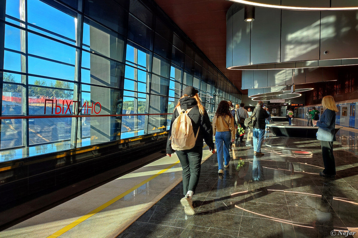 На прошлой неделе свершилось открытие станции метро Пыхтино. Долгое время наблюдала за ее строительством, не верилось, что ее откроют в срок. Разумеется я понеслась смотреть ее в первый же день. Дело было вечером. Решила проехать сначала до станции Аэропорт Внуково, о ней расскажу завтра. Не удержалась, сделала несколько фотографий через открытые двери поезда. Уж очень яркий дизайн и необычная архитектура станции. Вернулась, чтобы рассмотреть в деталях. На путевой стене чертежи советских самолетов, от винтовых до сверхзвукового Ту-160. Получается такая хронологическая лента. Полы и стены отделаны серым гранитом. Гигантские светильники на потолке напоминают турбины. Еще необычные скамейки в форме незамкнутого круга. С одной стороны платформы есть описание станции и самолетов. Пока открыт только один выход. В будущем обещают благоустроить парк вдоль реки, тогда наверное откроют второй выход в ту сторону. Притяжением всеобщего внимания стала модель самолета Ту-144 над эскалатором. Мало кт