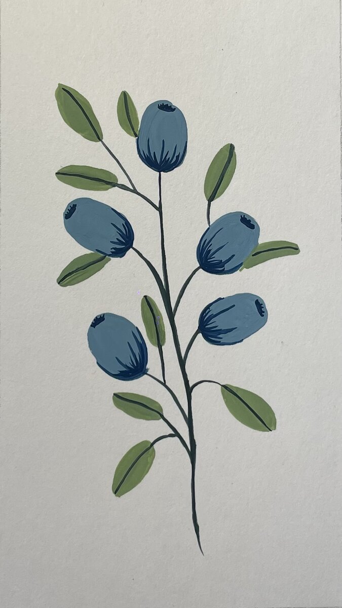 Рисуем пять голубых овалов, это будут наши ягодки. Их можно разместить в хаотичном порядке. Добавляем веточку темно-зеленого цвета. Синим цветом рисуем на ягодах линии как показано в примере. Добавляем ещё маленькие линии и верхушку ягоды. Между ягод располагаем листики. И к ним подрисовываем прожилки и веточки.