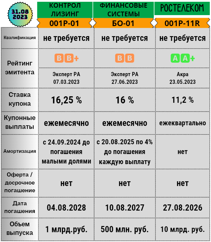 😎 Доброе утро, друзья! Последний летний денёк радует новинками на любой вкус и цвет. Сначала планировал рассказать о двух бумагах, но все же и третью стороной обойти нельзя, поехали! 1️⃣ КОНТРОЛ ЛИЗИНГ - первый дебютант долгового рынка. Собственно, в связи с этим абзац с историей размещений и имеющимися долгом можно оптимизировать, чтобы читать было поменьше, лучше расскажу немного о компании. 🔹 Начало деятельности - 2011 год. Сама специфика очевидна из названия - направление лизинга легковых автомобилей, коммерческого транспорта — нового и с пробегом, спецтехники для юридических лиц и ИП. Специализируется на финансировании таксопарков, магистральной техники и коммерческого транспорта с нулевым авансом. Информируют о наличии почти 20000 лизинговых контактов и 42 млрд. руб. в лизинговом портфеле. Город основания - Санкт-Петербург. Безусловно, постараюсь принять участие сегодня на вторичке, параметры (в табличке ниже) для меня интересны. 2️⃣ ФИНАНСОВЫЕ СИСТЕМЫ - второй дебютант д