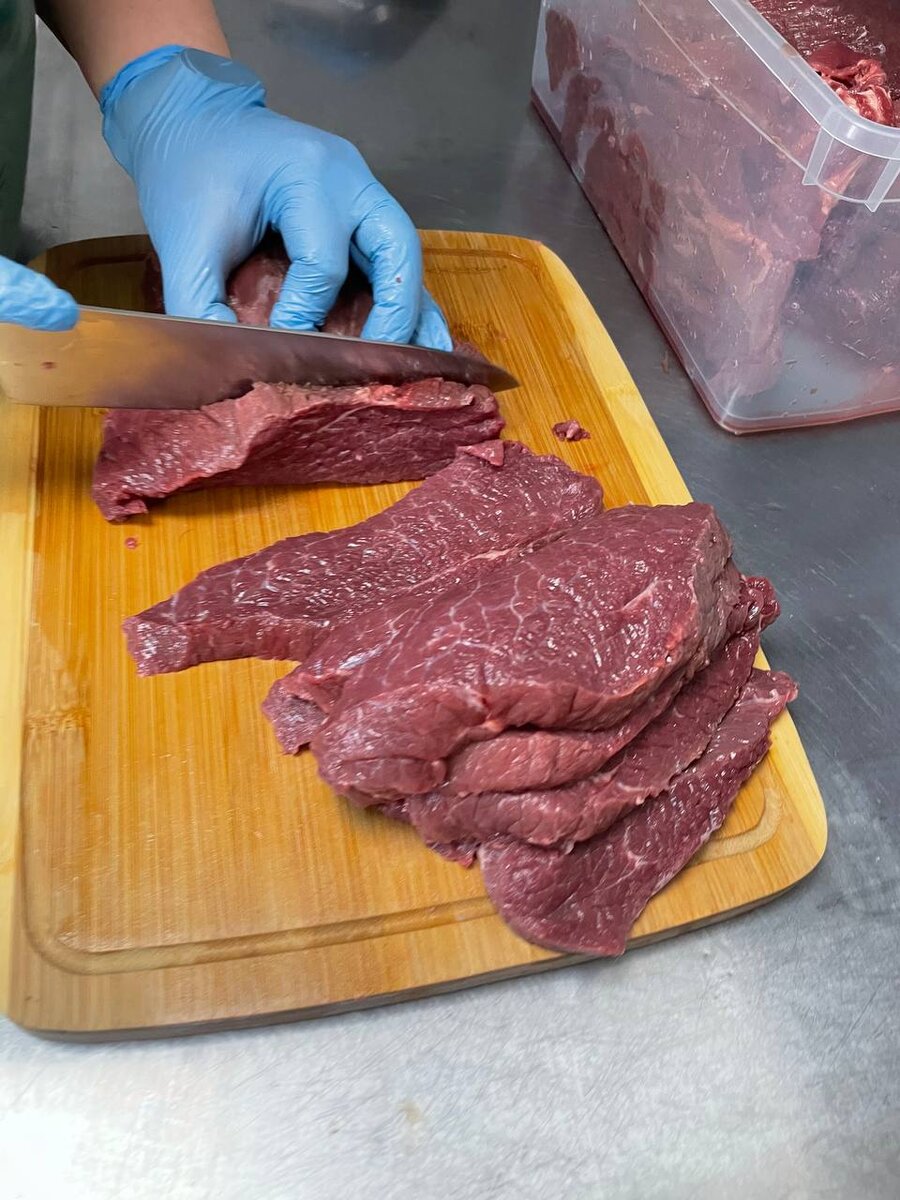 Ручная обвалка занимает больше времени и является наиболее качественной, так как работник бренда ЧипСтейк может контролировать процесс и учитывать индивидуальные особенности каждого куска мяса. После ручной обвалки мяса, мясо натуральное на все 100% без жира, жил и костей.