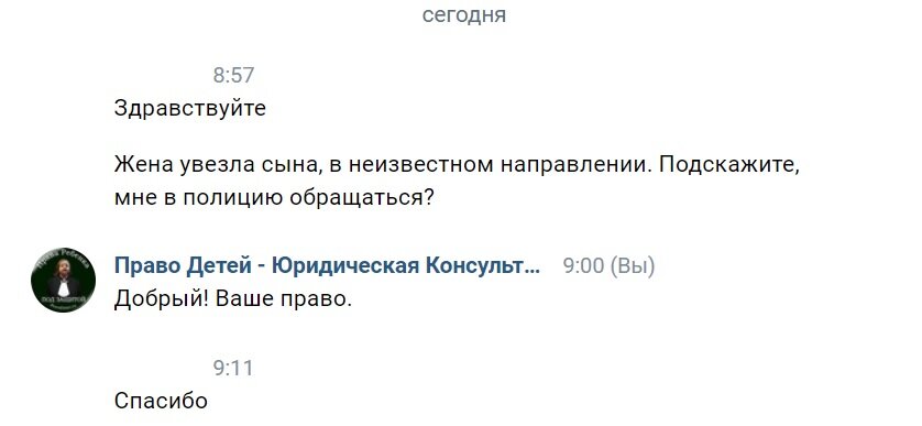 День работы семейного адвоката. Вот к нам в паблик поступил вопрос, отмечу к адвокатам, а не к психологам. Поэтому разговор только конкретный. Отмечу, что мы заманиваем клиентов не занимаемся, поэтому вопрос - ответ, пугать и рассказывать, что может быть, бесплатно не будем. Суть Жена увезла ребенка и скрывается. Могу ли я обратится в полицию? Конечно можете, это Ваше право. Получите ответ, с женой и ребенком все ок, место где они находятся сообщать не имеем права. Может ли жена, бабушка с дедушкой, да и вообще любой человек свинтить из региона РФ в другой регион РФ? Конечно может, это гарантируется Конституцией РФ. Что делать? Первоначально нужно узнать причину сокрытия лица. Ее не адвокат ищет, а психолог, но это денег стоит, поэтому искать нужно самому. Вполне допускаю, что мужик достал жену и ребенка в доме, либо обоих, либо одну. Еще причина, ну это попадосик, жена нашла другого и свинтила ... По практике только суд и прядок встреч с ребенком. Конечно же будут чинить препятствия